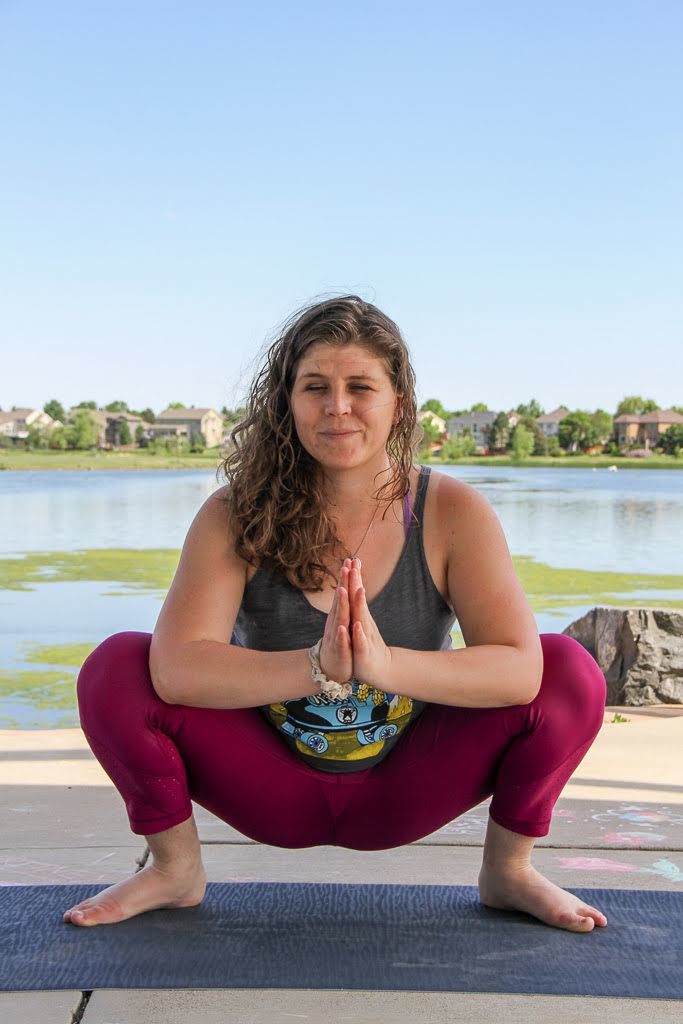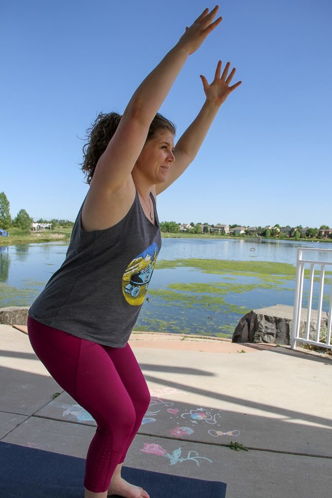 Spread your feet to the outside edges of your mat and turn your toes facing out. Drop your butt to a low squat position. You may feel like you are sitting on a Squatty Potty. Don’t worry too much about it. You are now in Garland Pose. Take five breaths as you settle in, feeling free to shift a little side to side. Once you get comfortable, engage your core and take your arms up as if you are raising Simba over a cliff. Hold for another three breaths.